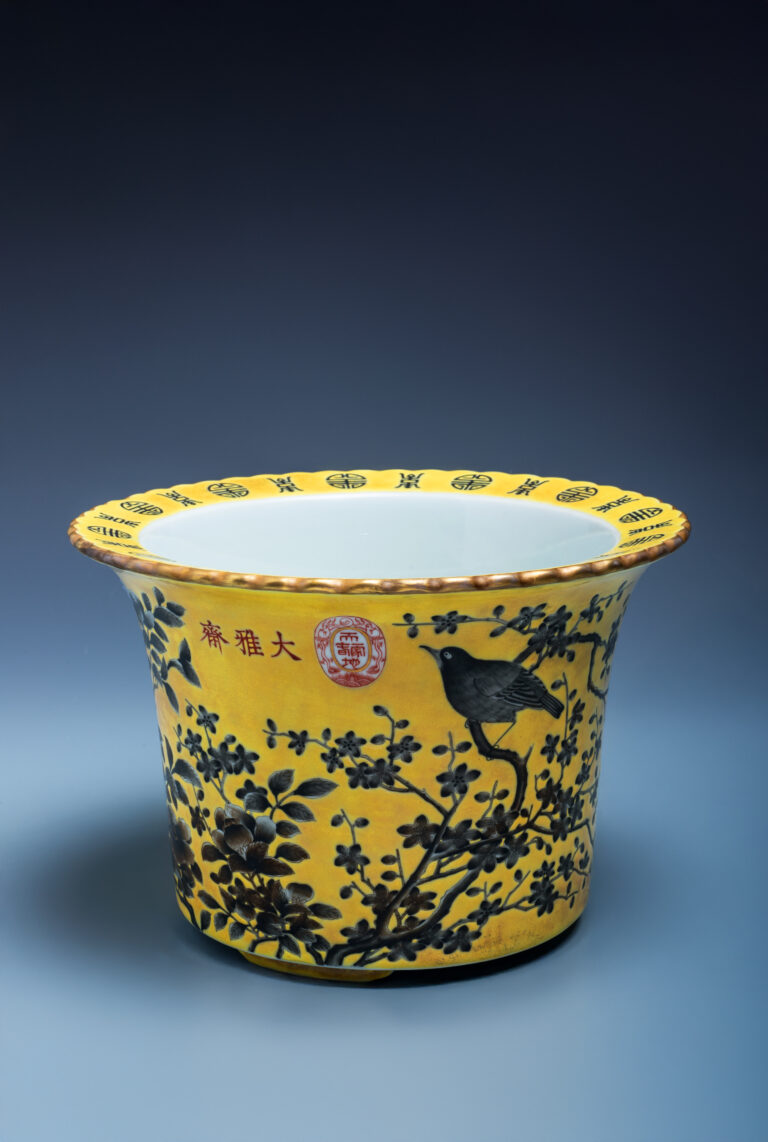 大雅齋黃地墨彩花鳥紋花盆