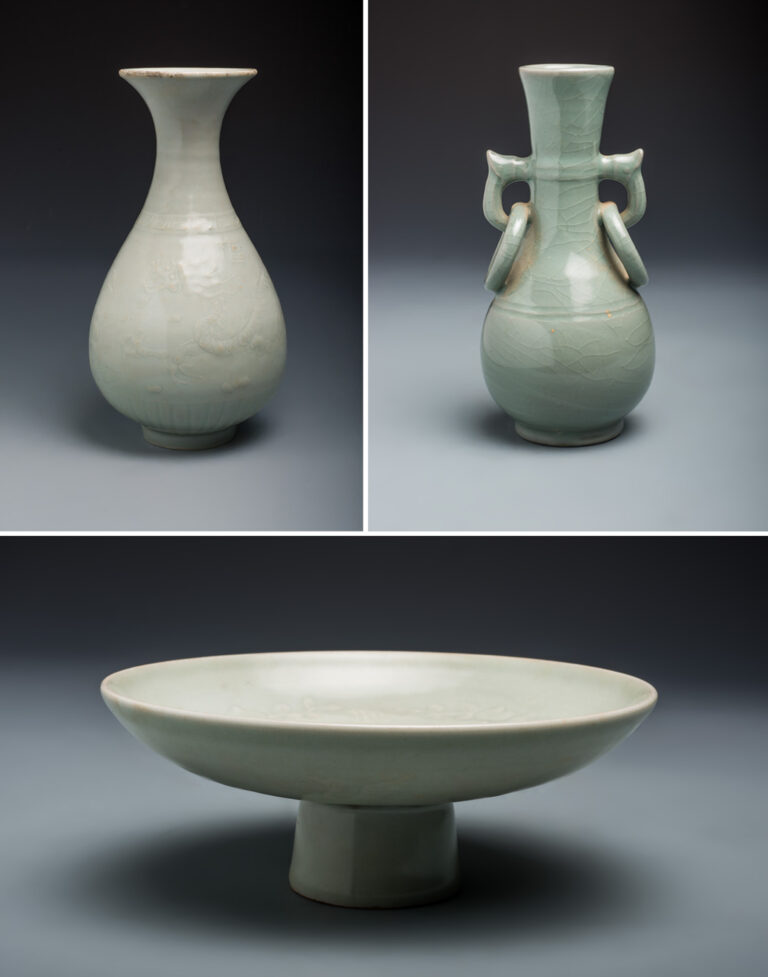 青釉弦紋帶環雙耳長頸瓶 白瓷印花龍紋玉壺春瓶/青瓷印花壽桃紋高足盤