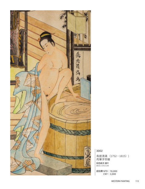 3001 3002 鈴木春信 (1724—1770) 鳥居清滿 (1752—1815)) 春宮圖 肉筆浮世繪 版畫紙本 畫心 設色紙本 鏡片 17.5 x 25 cm 64.5 x 31.5 cm NTD:20,000-50,000 起拍價 NTD:10,000 CNY:4,000-10,000 CNY:2,000 112 Art#1 International Auction WESTERN PAINTING 113