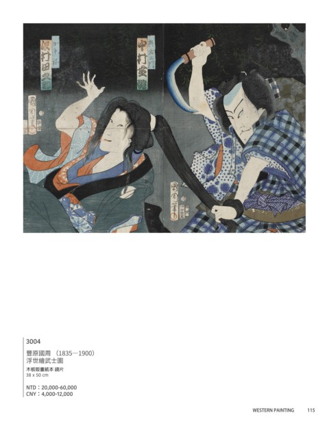 3003 3004 歌川豐國 (1786—1865)) 豐原國周 (1835—1900) 魁井內記與四宮坊太郎 浮世繪武士圖 版畫紙本 鏡片 木板版畫紙本 鏡片 34 x 25 cm 38 x 50 cm NTD:20,000-30,000 NTD:20,000-60,000 CNY:4,000-6,000 CNY:4,000-12,000 114 Art#1 International Auction WESTERN PAINTING 115
