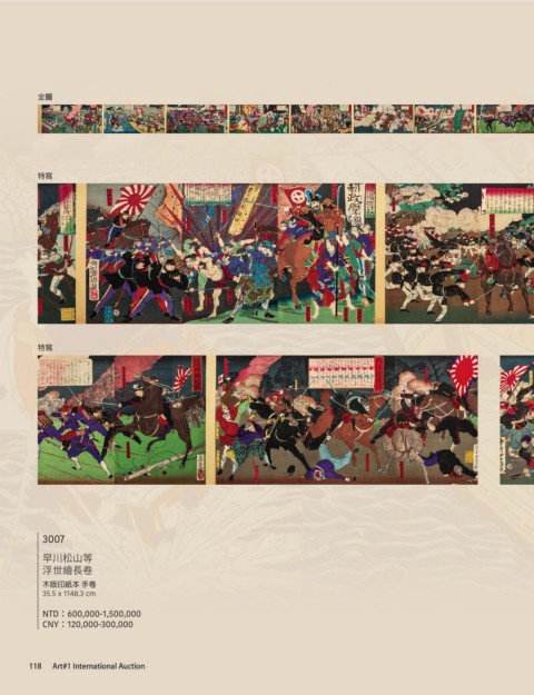 全圖 特寫 特寫 3007 早川松山等 浮世繪長卷 木版印紙本 手卷 35.5 x 1148.3 cm NTD:600,000-1,500,000 CNY:120,000-300,000 118 Art#1 International Auction WESTERN PAINTING 119