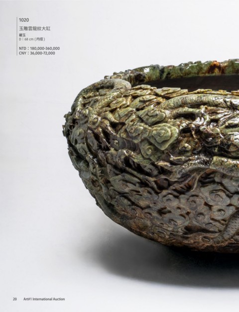 1020 玉雕雲龍紋大缸 碧玉 D:68 cm ( 內徑 ) NTD:180,000-360,000 CNY:36,000-72,000 20 Art#1 International Auction CULTURAL RELICS 21
