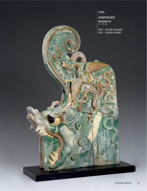 1043 1045 木雕螭龍紋花几 綠釉陶製鴟尾 木 磚 附黑色木座 H:87 cm H:90 cm 起拍價 NTD:10,000 NTD:50,000-100,000 CNY:2,000 CNY:10,000-20,000 1044 紅木嵌玉雕花櫃 木 / 玉 H:27 cm 起拍價 NTD:10,000 CNY:2,000 36 Art#1 International Auction CULTURAL RELICS 37