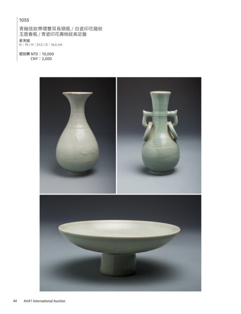 1055 1056 底部| 青釉弦紋帶環雙耳長頸瓶 / 白瓷印花龍紋 青花鬼谷子下出雙鋪首大罐 玉壺春瓶 / 青瓷印花壽桃紋高足盤 瓷 附盒 瓷 附盒 H:40 cm H:19 / H:21.5 / D:16.5 cm 款識|吉相、福地。 起拍價 NTD:10,000 CNY:2,000 NTD:80,000-160,000 CNY:16,000-32,000 44 Art#1 International Auction CULTURAL RELICS 45