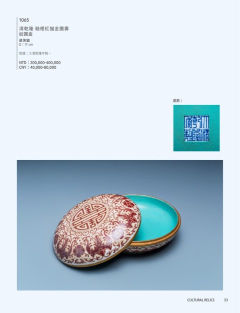 1064 1065 黑釉葉紋盞 清乾隆 釉裡紅描金團壽 瓷 附盒 紋圓盒 D:16 cm 瓷 附盒 D:17 cm 起拍價 NTD:10,000 CNY:2,000 款識|大清乾隆年製。 NTD:200,000-400,000 CNY:40,000-80,000 碗內| 底部| 底款| 52 Art#1 International Auction CULTURAL RELICS 53