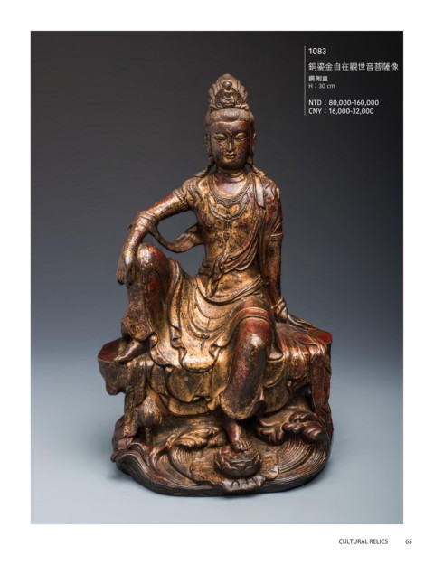 1082 1083 明永樂 銅鎏金文殊菩薩坐像 銅鎏金自在觀世音菩薩像 銅 附盒 銅 附盒 H:15 cm H:30 cm 款識|大明永樂年施。 NTD:80,000-160,000 CNY:16,000-32,000 NTD:50,000-100,000 CNY:10,000-20,000 邊款| 64 Art#1 International Auction CULTURAL RELICS 65