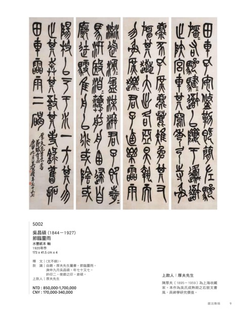 碩交往頻密。本作屬吳氏晚年 NTD : 850,000-1,700,000 家。本作為吳氏成熟期之石鼓文書