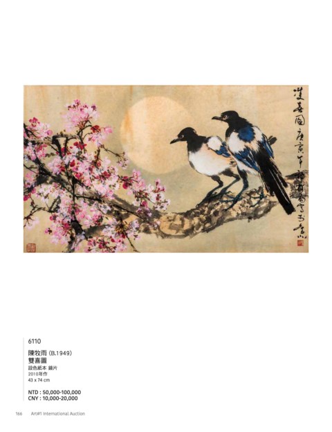 6110 6111 陳牧雨 (B.1949) 雙喜圖 陳牧雨 (B.1949) 設色紙本 鏡片 楓橋夜泊 2010年作 設色紙本 鏡片 43 x 74 cm 185 x 94 cm NTD : 50,000-100,000 NTD : 250,000-500,000 CNY : 10,000-20,000 CNY : 50,000-100,000 166 Art#1 International Auction 水墨專場 167