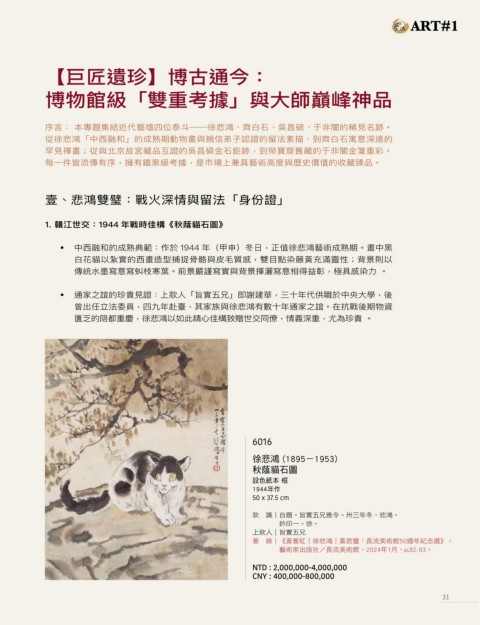 日本上流社會對中國文人畫的高度鑑賞品味,亦佐證了作品的來源珍稀性與流傳可靠度 。 序言: 本專題集結近代藝壇四位泰斗——徐悲鴻、齊白石、吳昌碩、于非闇的稀見名跡。