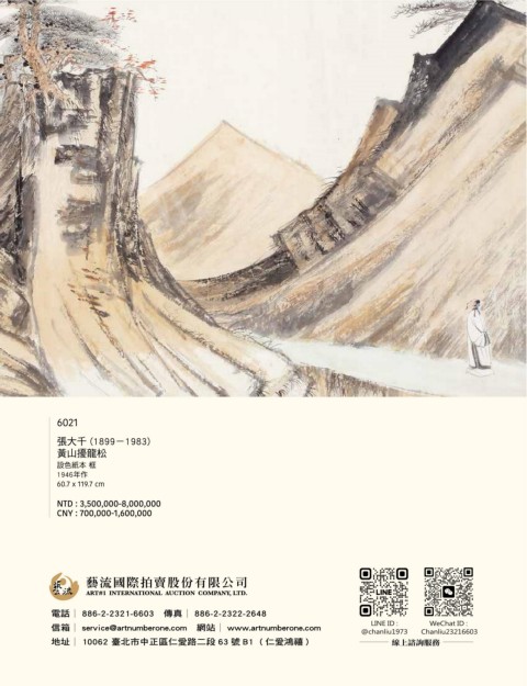 6021 張大千 (1899-1983) 黃山擾龍松 設色紙本 框 1946年作 60.7 x 119.7 cm NTD : 3,500,000-8,000,000 CNY : 700,000-1,600,000 電話│ 886-2-2321-6603 傳真│ 886-2-2322-2648 信箱│ service@artnumberone.com 網站│ www.artnumberone.com 地址│ 10062 臺北市中正區仁愛路二段 63 號 B1 ( 仁愛鴻禧 ) 36