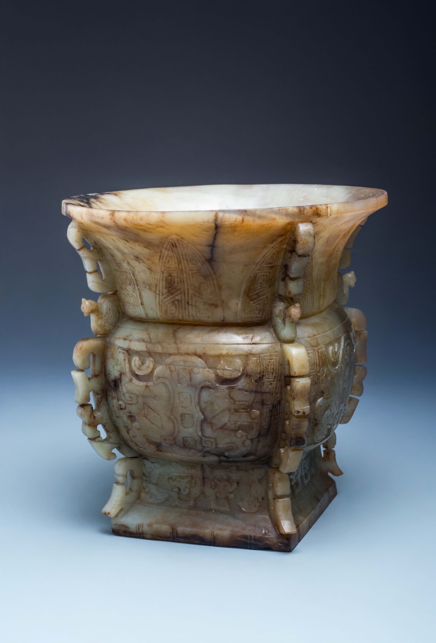 L1014 玉獸面紋出戟觚形方尊玉 H:19cm 附盒