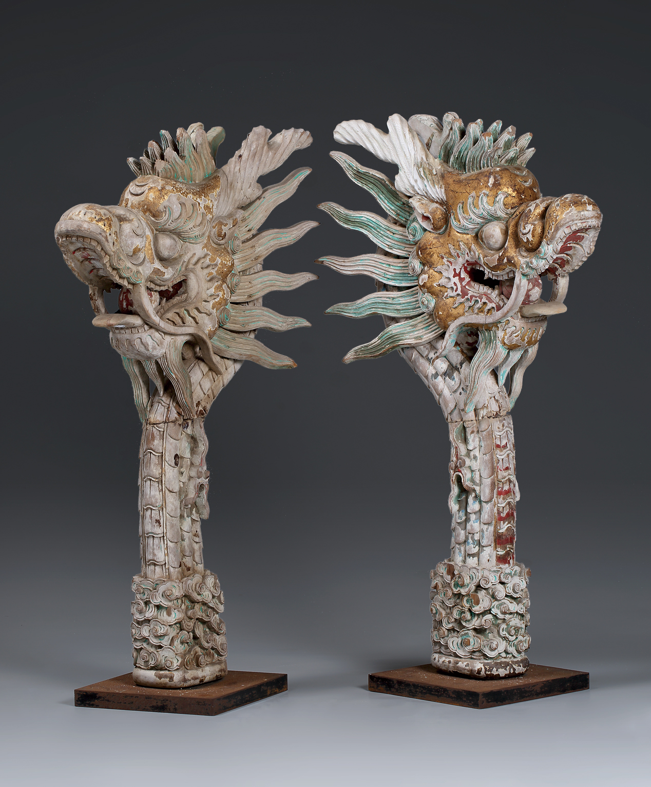 L1042 木雕彩繪龍首一對木 H:83cmx2 附銅板支架2件