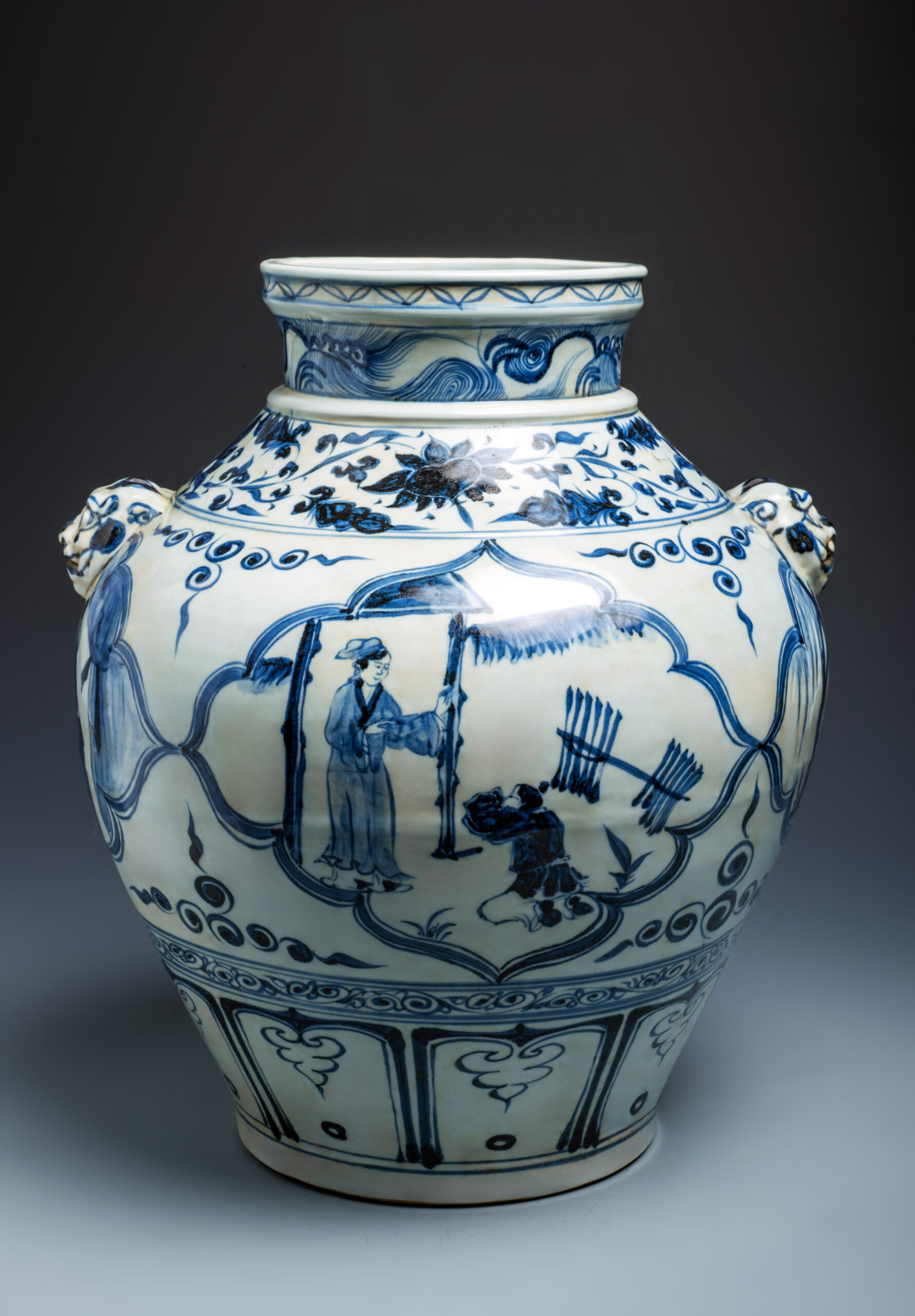 L1056 青花鬼谷子下出雙鋪首大罐瓷 H:40cm 附盒款識:吉相、福地。