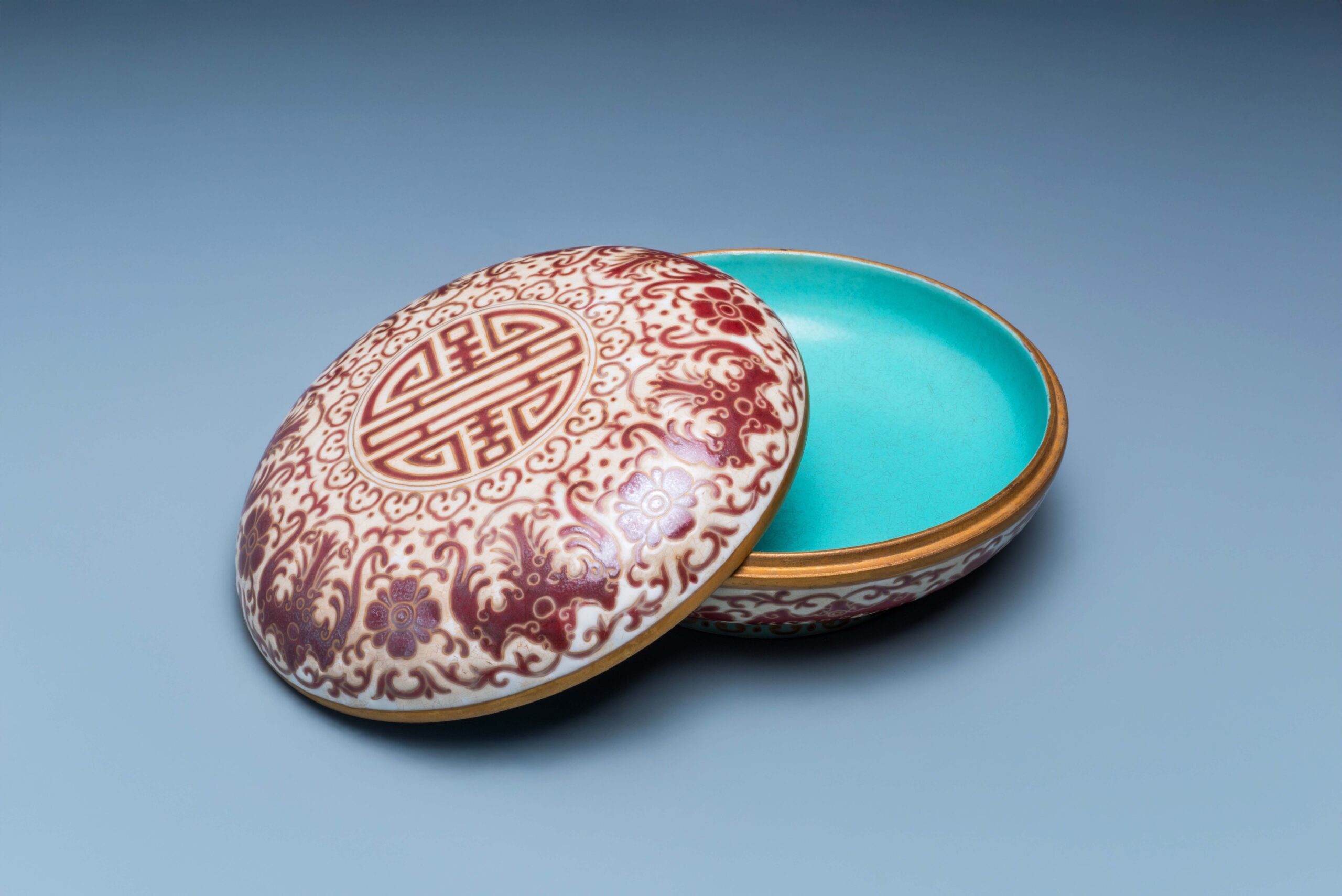 L1065 清乾隆 釉裡紅描金團壽紋圓盒瓷 D:17cm 附盒款識:大清乾隆年製。
