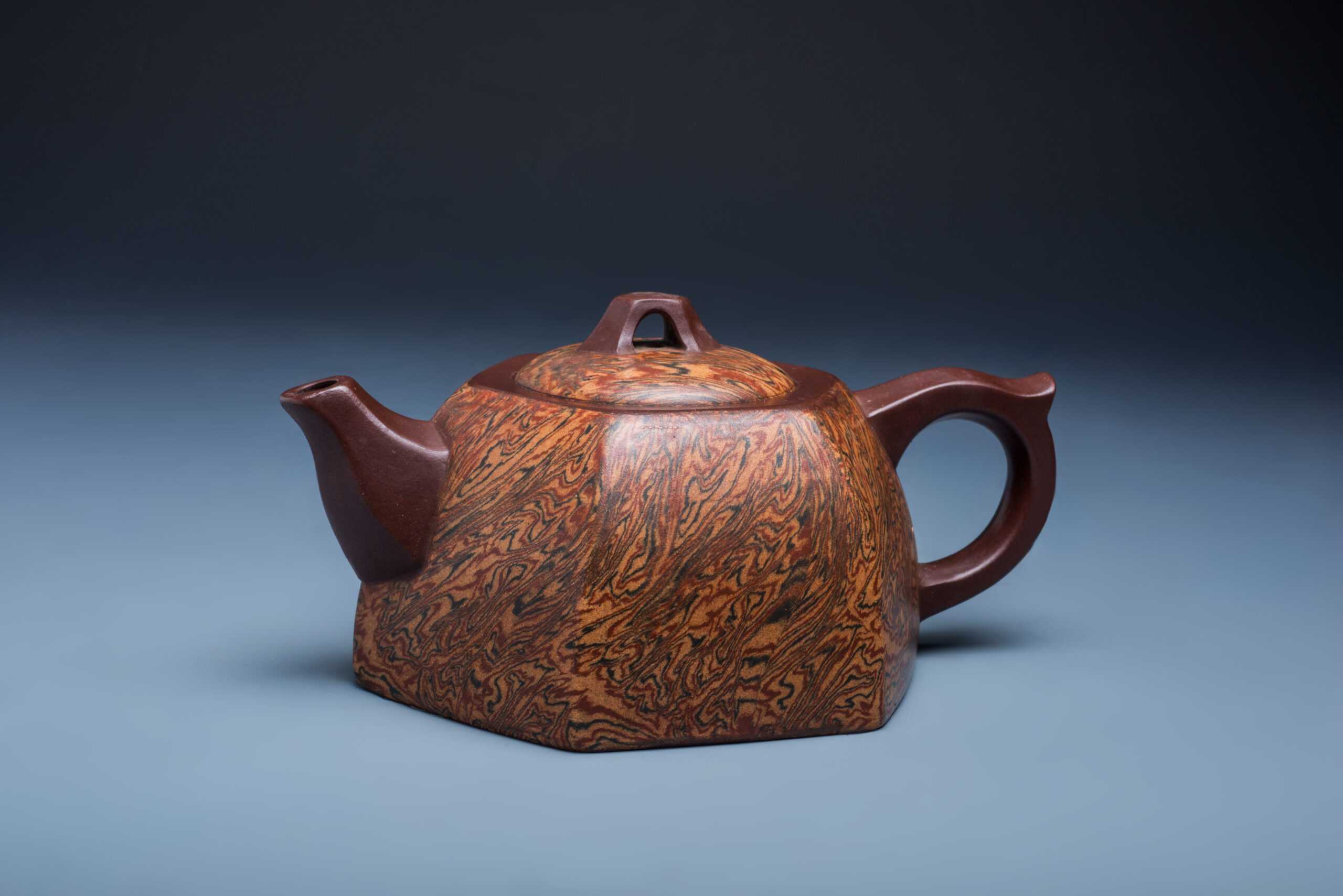 L1073 呂堯臣(B.1940);紫砂絞泥六方壺紫砂 L:15cm 附盒款識:堯臣肖形印(蓋款)、吕记(蓋款)、堯臣壺(底款)。
