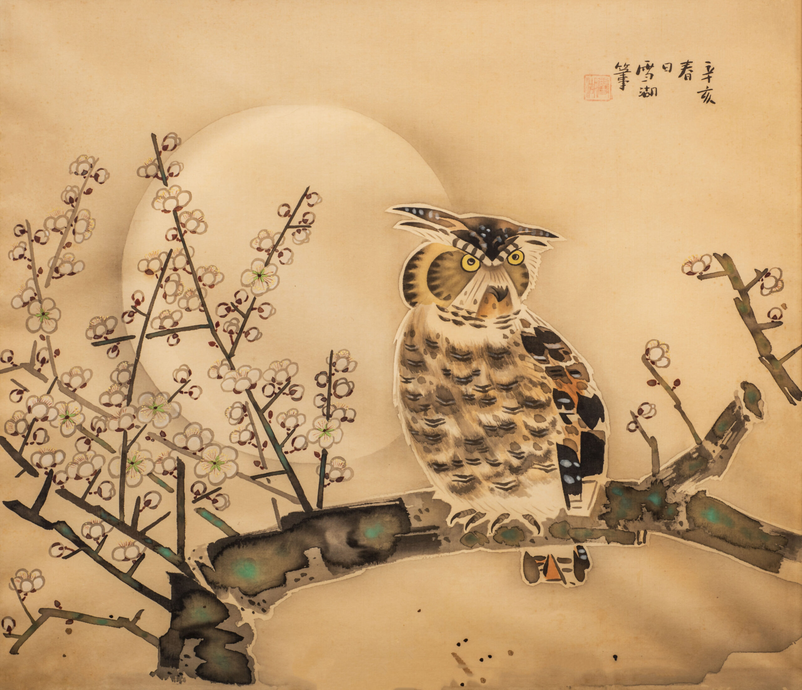 L2022 郭雪湖(1908-2012);貓頭鷹膠彩絹本 1971年作 45x52cm 框款識:自題。辛亥春日雪湖筆。鈐印一。雪湖。