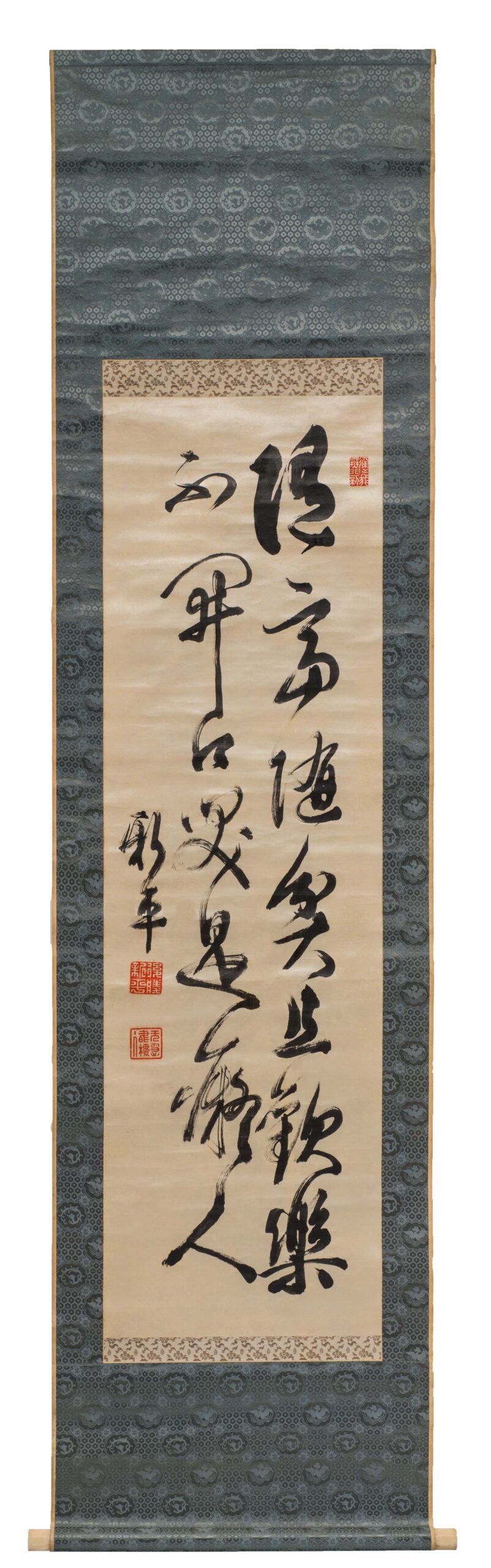 L5004 後藤新平(1857-1929);人間隨笑水墨絹本 119x36cm 日本裱軸 附盒釋文:隨富隨貧且歡樂。不開口笑是痴人。款識:自題。新平。鈐印三。後藤新平。天慧書樓主人。適我無非新。