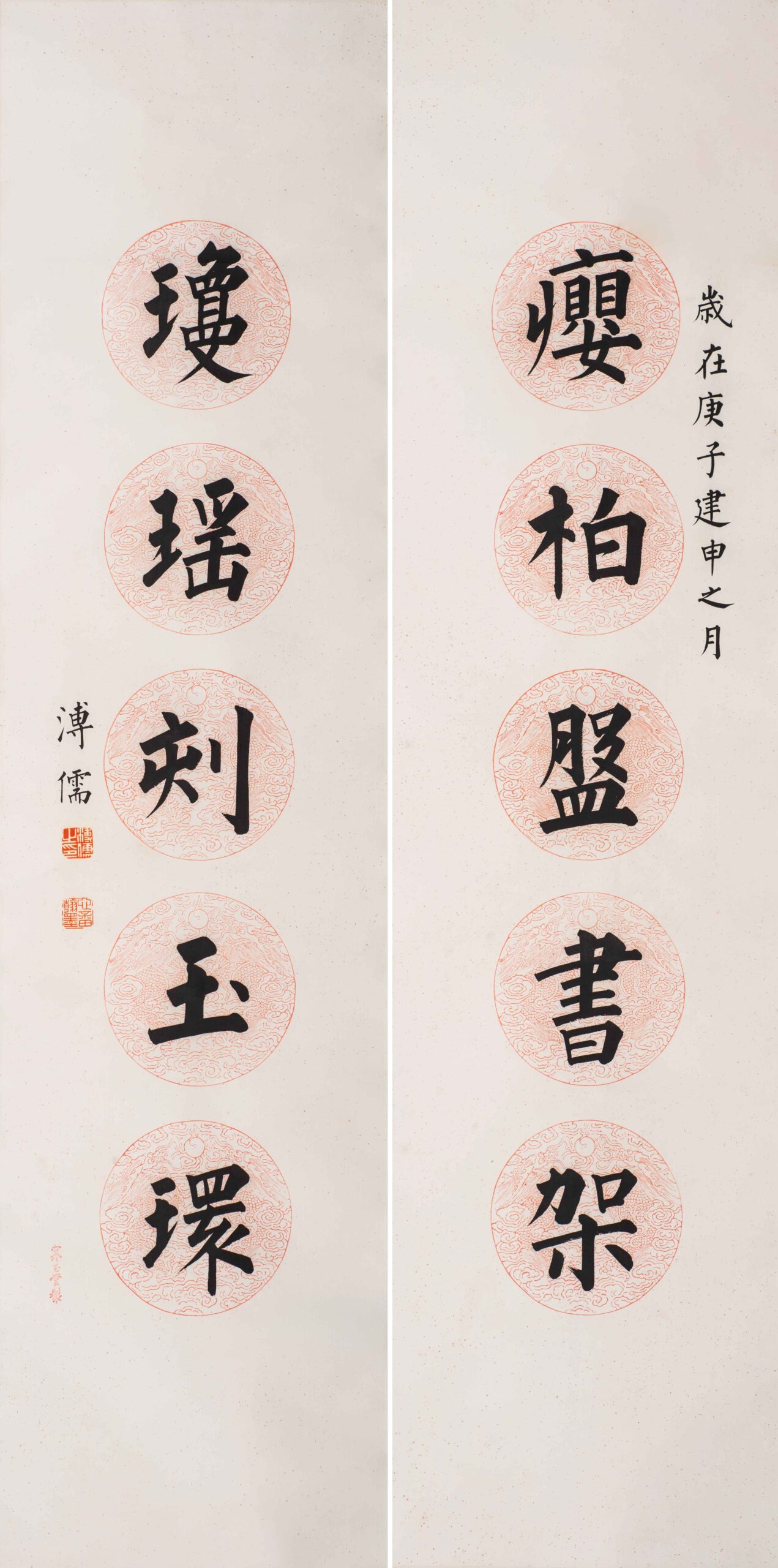 L5025 溥儒(1896-1963);癭柏瓊瑤水墨紙本 1960年作 138x35cmx2 軸釋文:癭柏盤書架,瓊瑤刻玉環。款識:自題。歲在庚子建申之月。溥儒。鈐印二。溥儒之印。心畬翰墨。