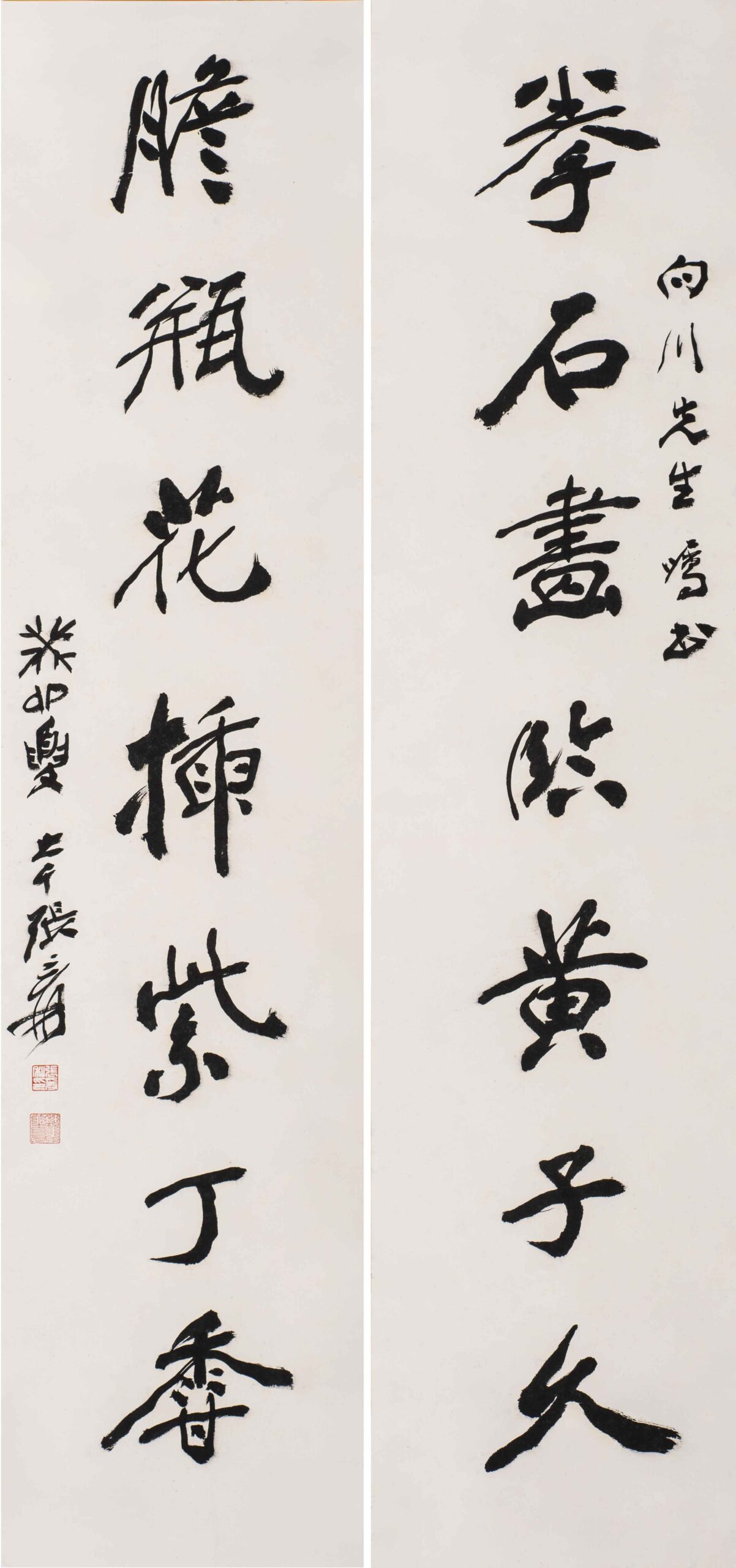 L5028 張大千(1899-1983);拳石膽瓶水墨紙本 1963年作 133x31cmx2 鏡片釋文:拳石畫臨黃子久。膽瓶花插紫丁香。款識:自題。向川先生囑書。癸卯夏。大千張爰。鈐印二。張爰私印。張爰之印。上款人:向川先生