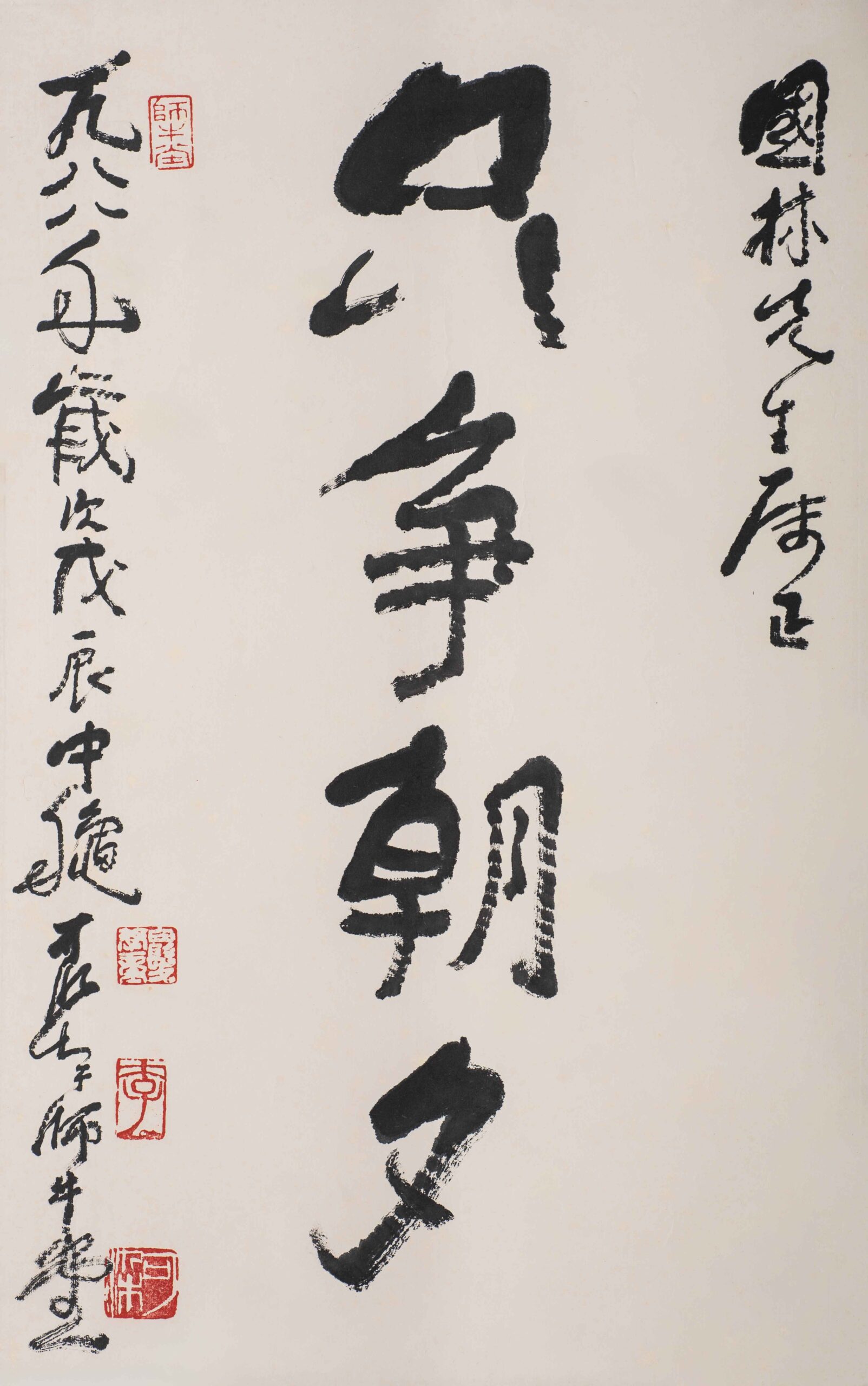 L5034 李可染(1907-1989);只爭朝夕水墨紙本 1988年作 59.5x38cm 鏡片釋文:只爭朝夕。款識:自題。國林先生屬正。一九八八年歲次戊辰國林先生屬正。一九八八年歲次戊辰中秋可染于師牛堂。鈐印四。白髮學童。李。可染。師牛堂。上款人:國林先生