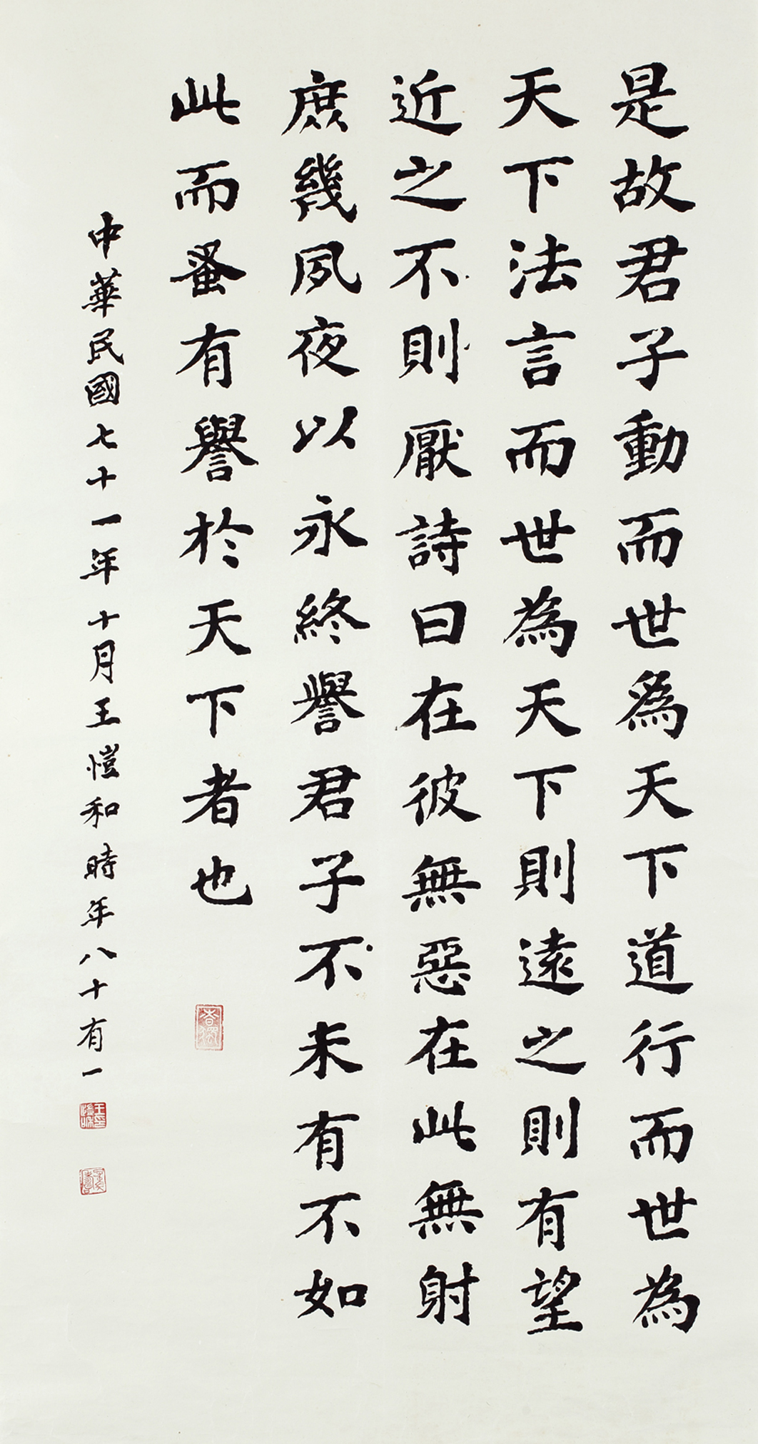 L5043 王愷和(1901-1997);楷書中堂水墨紙本 1982年作 136×69.5cm 鏡片款識:自題。中華民國七十一年十月。王愷和。十年八十有一。鈐印三。王愷和印。子中長壽。春獨。資料:《長流藝聞 No.054》,長流美術館,1995年1月,p.25。《長流藝聞 No.323》,長流美術館,2018年3月,p.31。