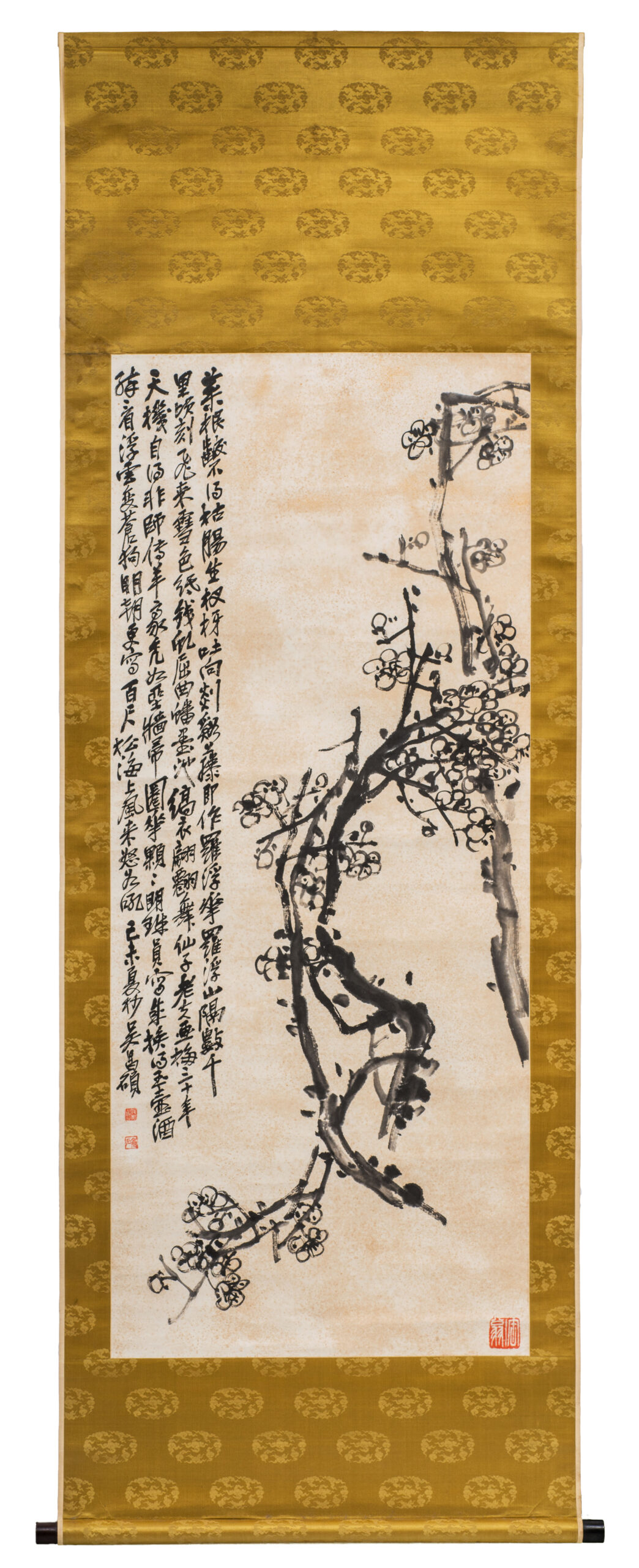 L6009 吳昌碩(1844-1927);白梅水墨紙本 1919年作 132.5x56cm 日本裱軸 款識:自題。己未夏杪。吳昌碩。鈐印二。俊卿之印。倉石。資料:《長流藝聞 No.087》,長流美術館,1997年10月,p.5。《長流藝聞 No.332》,長流美術館,2018年12月,p.21。《吳昌碩|齊白石|傅抱石:長流美術館50週年紀念選》,藝術家出版社/長流美術館,2024年1月,p.53。