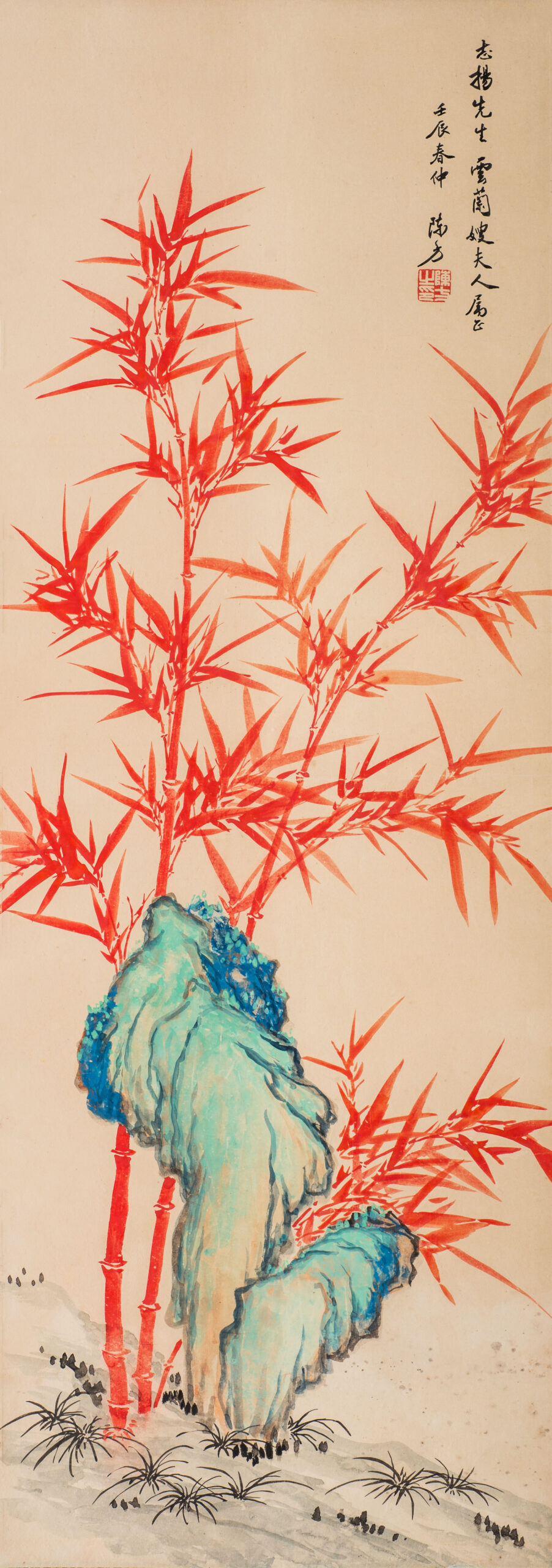L6018 陳方(1897-1962);朱竹設色紙本 1952年作 93.5x33cm 鏡片款識:自題。志揚先生雲蘭嫂夫人屬正。壬辰春仲。陳方。鈐印一。陳方之印。上款人:志揚先生雲蘭嫂夫人資料:《長流藝聞 No.117》,長流美術館,2000年4月,p.6。