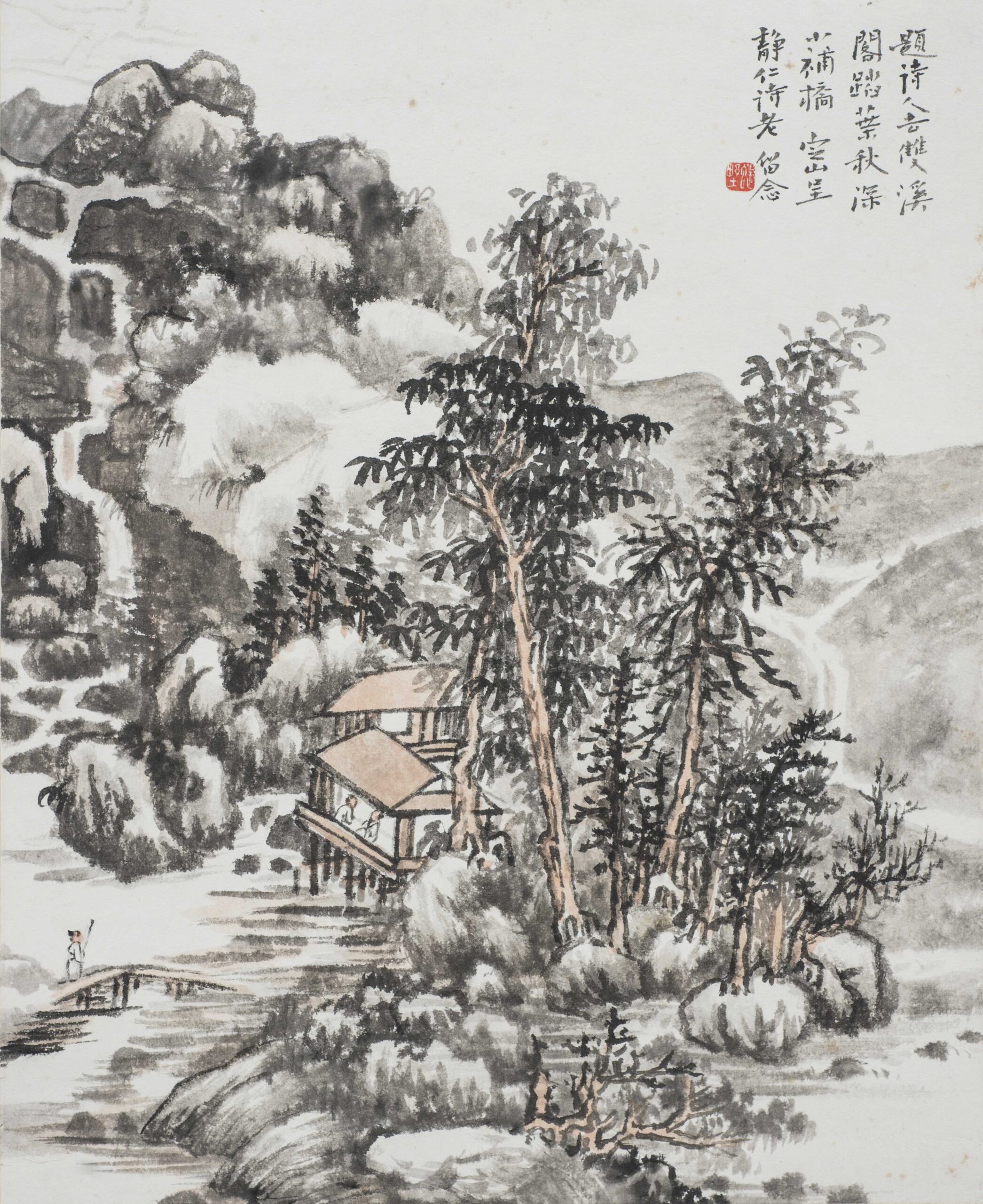 L6019 陳定山(1897-1987);山水設色紙本 40×32.7cm 鏡片款識:自題。題詩人去雙溪閤。踏葉秋深小補橋。定山呈靜仁詩老留念。鈐印一。蝶野。