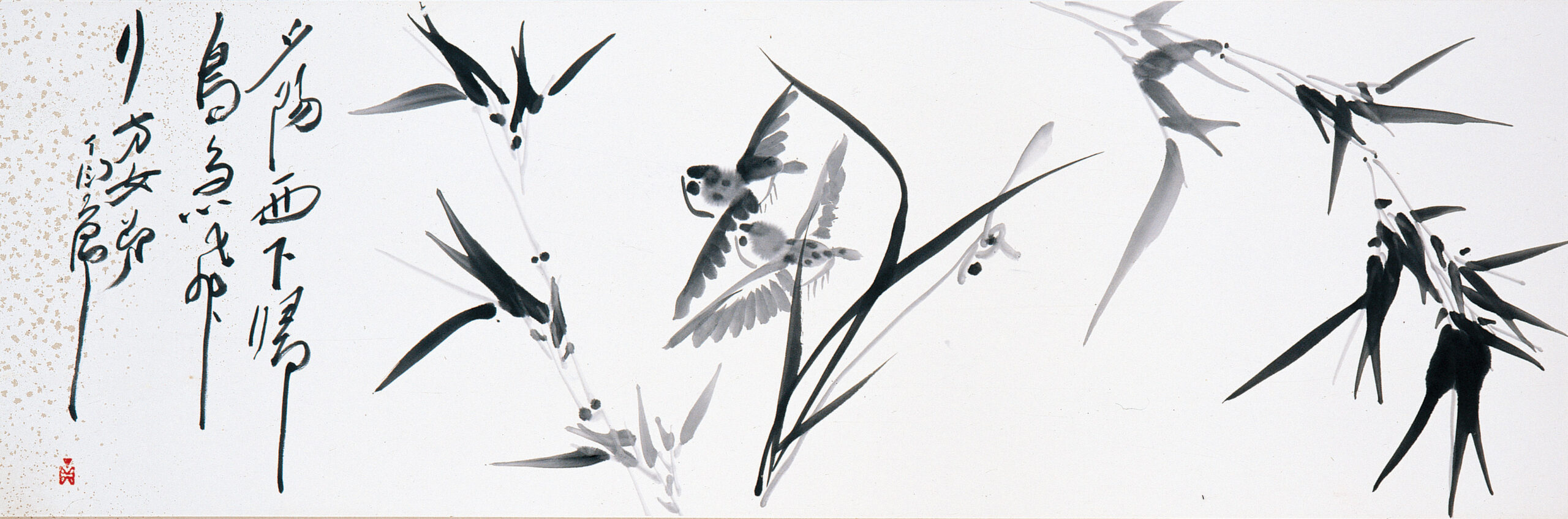 L6022 丁衍庸(1902-1978);蘭竹飛雀水墨紙本 37.5x115cm 鏡片款識:自題。夕陽西下。歸鳥急飛。行方女弟。丁衍庸。鈐印一。庸。