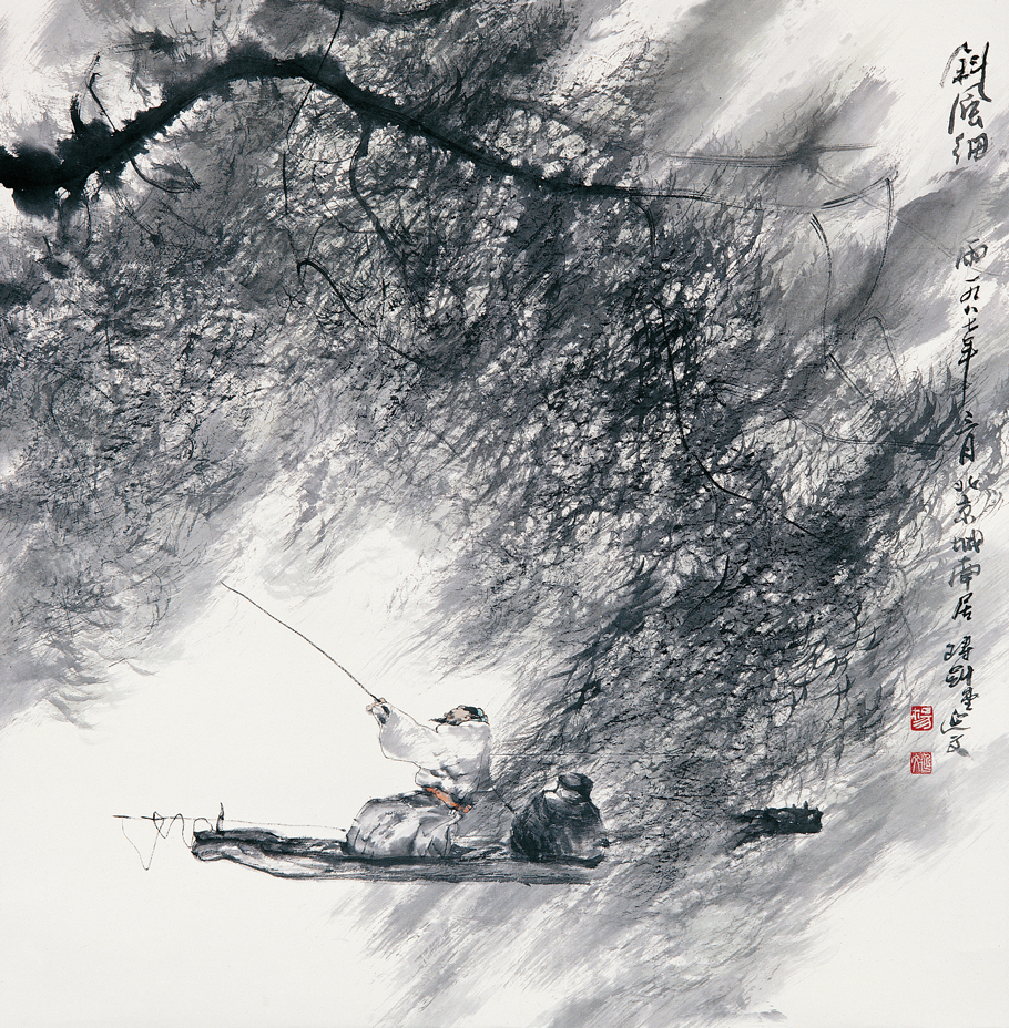 L6042 楊延文(1939-2019);斜風細雨設色紙本 1987年作 67.5×66.5cm 軸款識:自題。斜風細雨。一九八七年三月。北京城南居。鑄劍堂。延文。鈐印二。楊。延文。資料:《長流藝聞 No.085》,長流美術館,1997年8月,p.7。