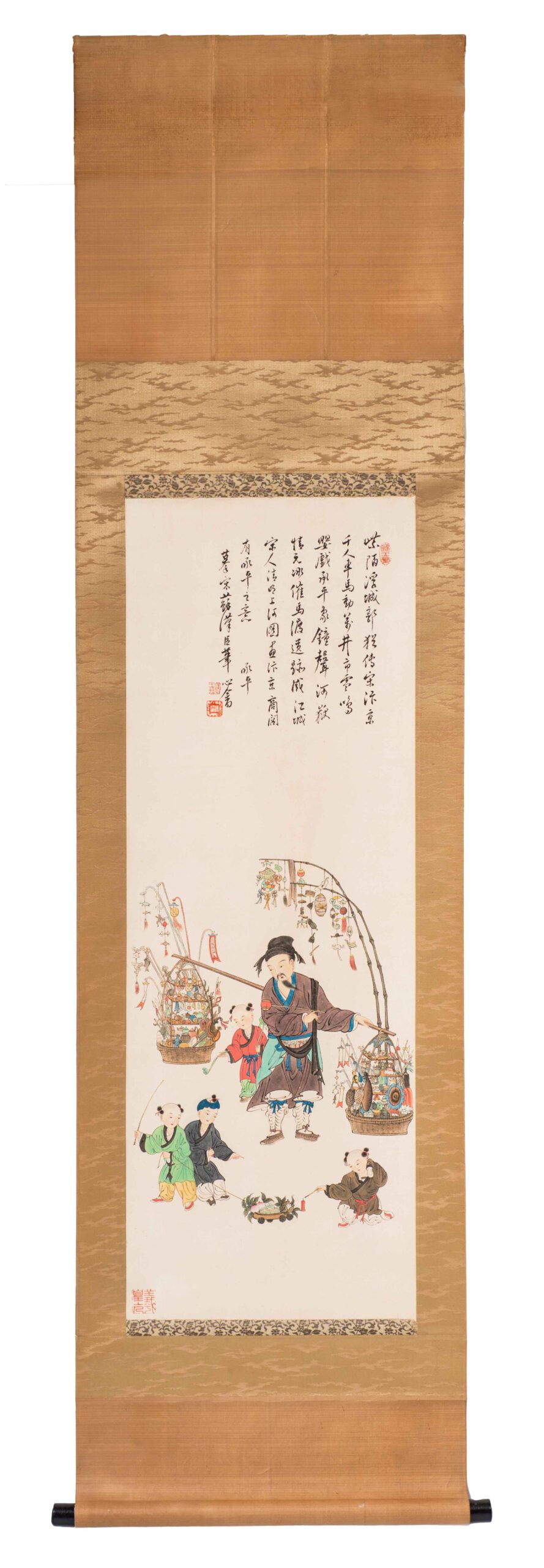 款識:自題。紫陌浮城郭。猶傳宋汴京。千人車馬動。萬井市雷鳴。嬰戲承平象。鐘聲河嶽情。元冰催馬渡。遺跡感江城。宋人清明上河圖畫汴京商閭有承平之意。摹宋蘇漢臣筆。心畬。鈐印三。舊王孫。溥儒。寒玉堂。羲皇上人。