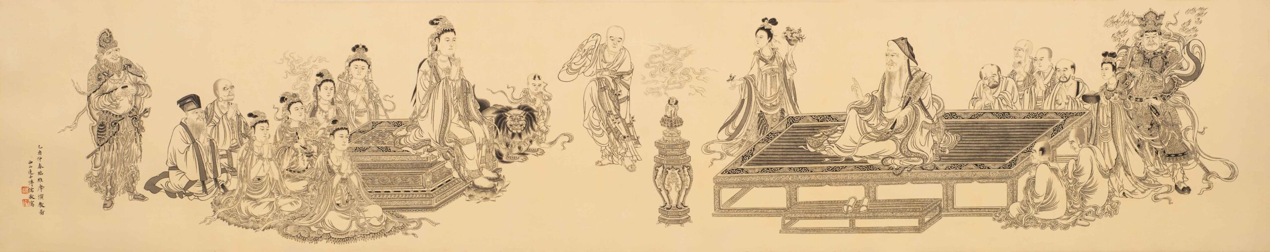 L6075 溥儒(1896-1963);維摩演教圖水墨絹本 1945年作 33x165cm 鏡片款識:乙酉仲春臨維摩演教圖圖。西山逸士溥儒敬寫。鈐印二。溥儒之印。心畬。