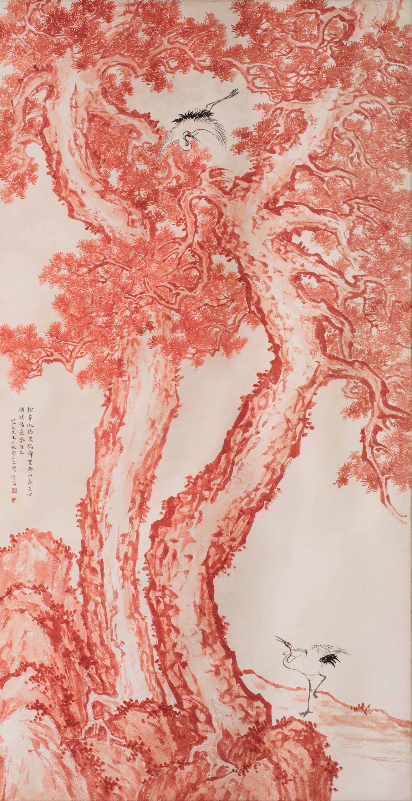 L6081 溥儒(1896-1963);蒼松白鶴設色紙本 1953年作 174x90cm 軸款識:自題。松蒼凝瑞氣,鶴舞鶴南山。歲久心猶健,福長樂百年。震武先生五秩晉三之慶。溥儒。鈐印二。溥儒之印。心畬。上款人:震五先生