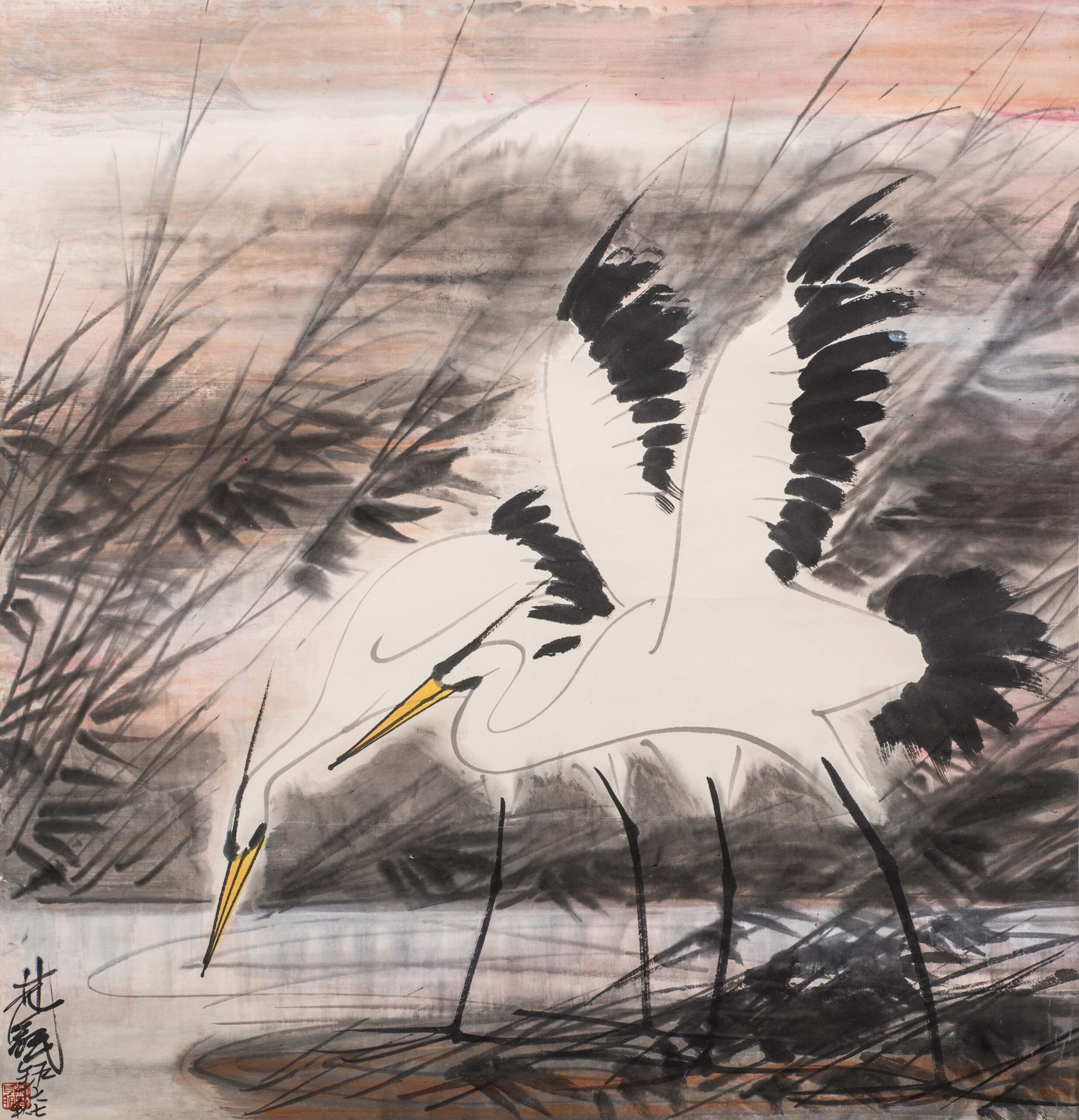 L6086 林風眠(1900-1991);雙鷺圖設色紙本 1977年作 68x66cm 鏡片款識:自題。林風眠。一九七七年秋。鈐印一。林風眠印。