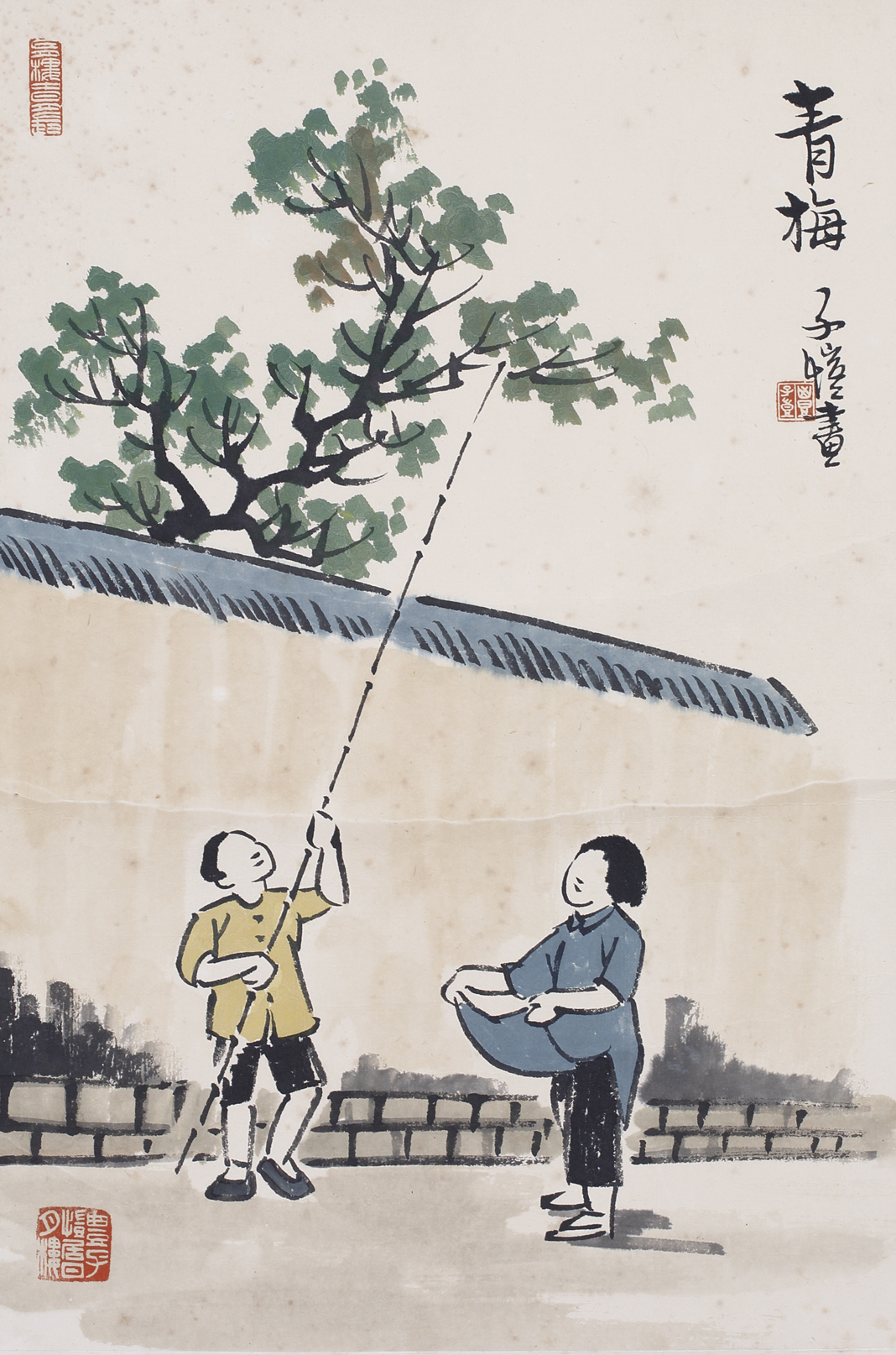 L6087 豐子愷(1898-1975);青梅設色紙本 33x24cm 框款識:自題。青梅。子愷畫。鈐印三。豐子愷。日月樓中日月長。豐子愷居日月樓。資料:《世紀的容顏―臺灣百年美術設計發展暨文獻展》,財團法人創價文教基金會,2023年5月,p.9、189。