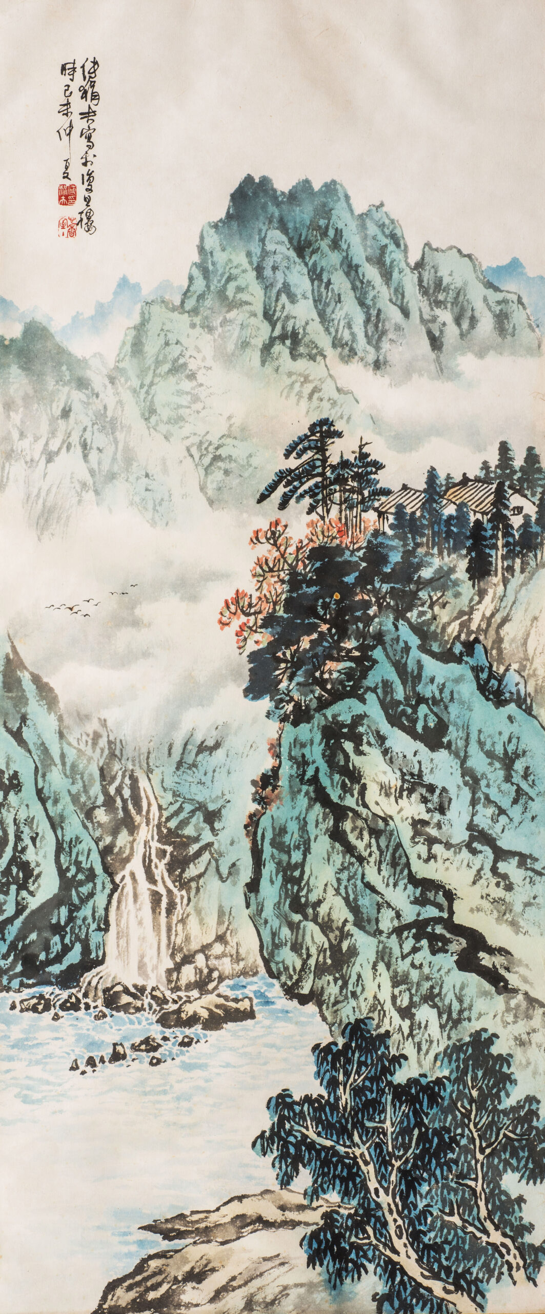 L6095 傅狷夫(1910-2007);山水設色紙本 1979年作 92×44.5cm 框款識:自題。傅狷夫寫於復旦樓。時已未仲夏。鈐印二。傅狷夫印。心香室主人