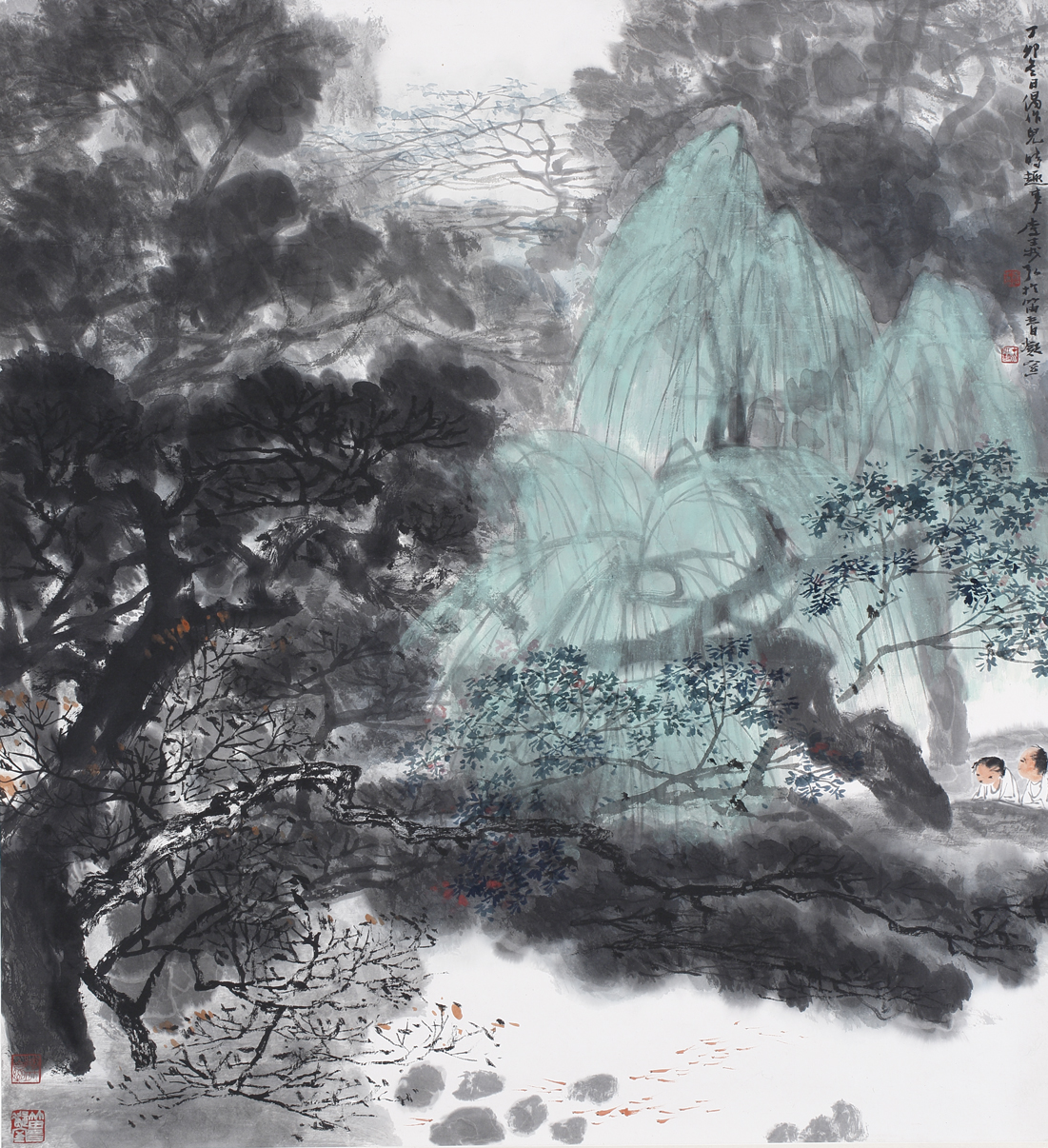 L6103 李義弘(1941-2023);兒時趣事設色紙本 1987年作 80x73cm 軸款識:自題。丁卯冬日偈。作兒時趣事。李義弘於笛音凝室。鈐印四。義弘之印。在川小鉥。陶然自樂。笛音凝室。