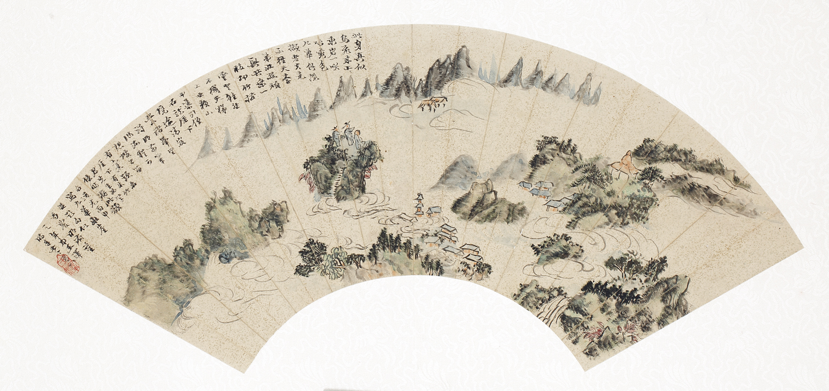 L6115 王澤(清);九華東崖設色灑金紙本 1836年作 17.5x53cm 鏡片款識:自題。此身真似鳥飛來,上上東岩一笑咍。秀色九華俱攬擷,老夫竟不徑天臺。弟壯孫頑興共乘,一枝楊竹撥塵登。雖然石棧天梯上,也賴山中導引僧。石龍厓下境逾清,岌業諸峰望得明。前輩風流猶可想,坡公留有舊題名。厓下有朱竹君先生,為學使時游此題名。道光丙申寫九華東崖並題句似昜農明府鑒之。年弟王澤時年七十有八。鈐印一。王澤。