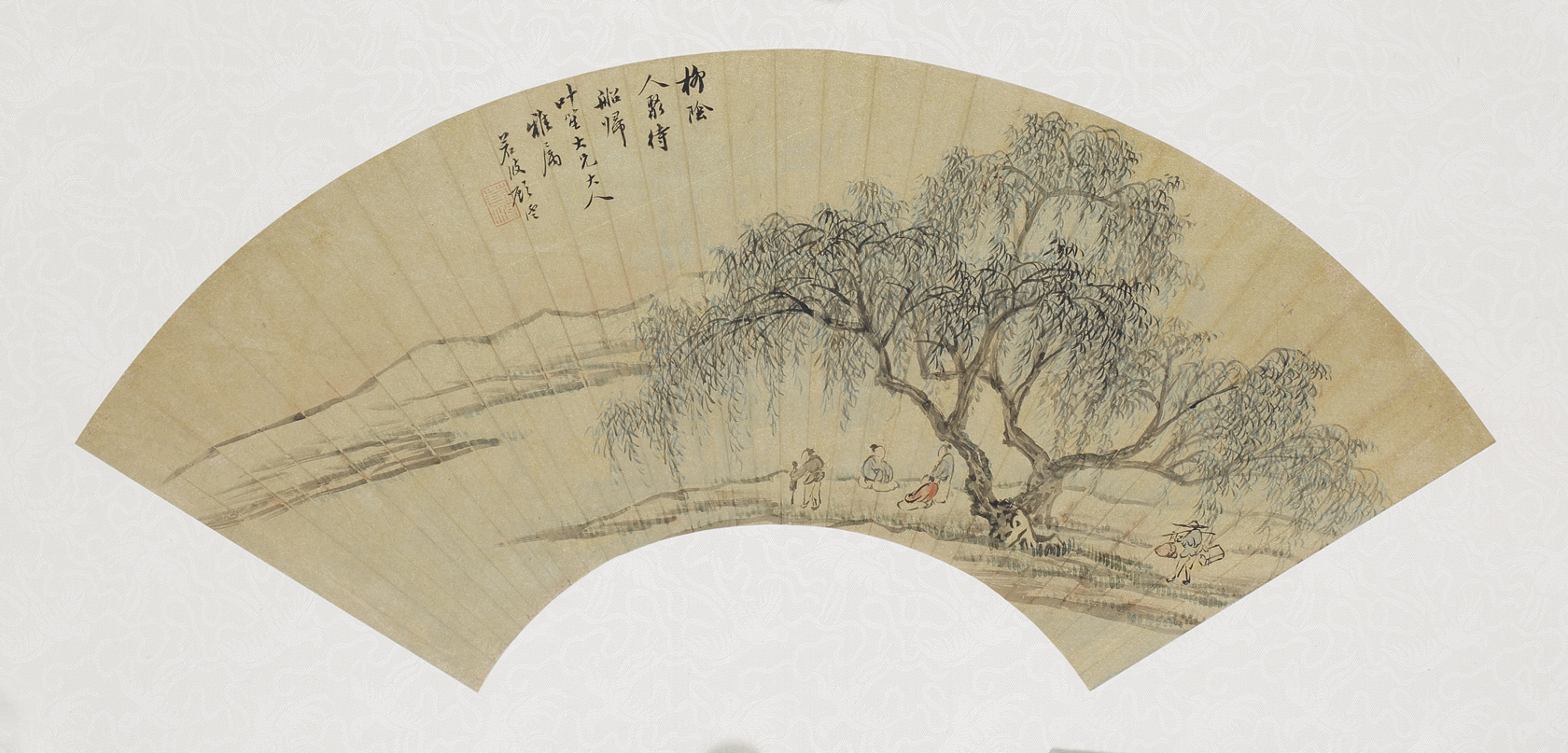 L6125 顧若波(1835-1896);柳蔭待歸設色金箋 18x53cm 鏡片款識:自題。柳陰人聚待船歸。葉笙大兄大人雅屬。若波顧雲。鈐印一。若波。