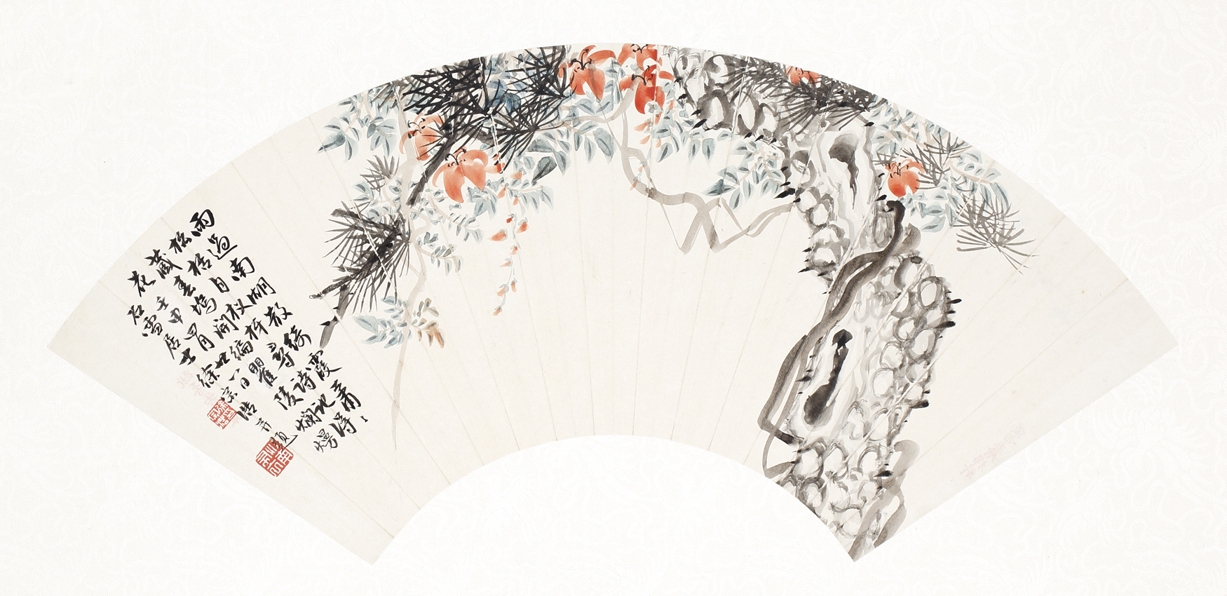 L6136 徐宗浩(1880-1957);峻松凌霄設色紙本 1932年作 17.5×50.5cm 鏡片款識:自題。雨過南湖散綺霞,蕭蕭松栝自杈枒。尋詩記得藏春塢,開徧瞿陵爛熳花。壬申四月廿八日,石雪居士徐宗浩並題。鈐印二。徐宗浩。江南布衣。